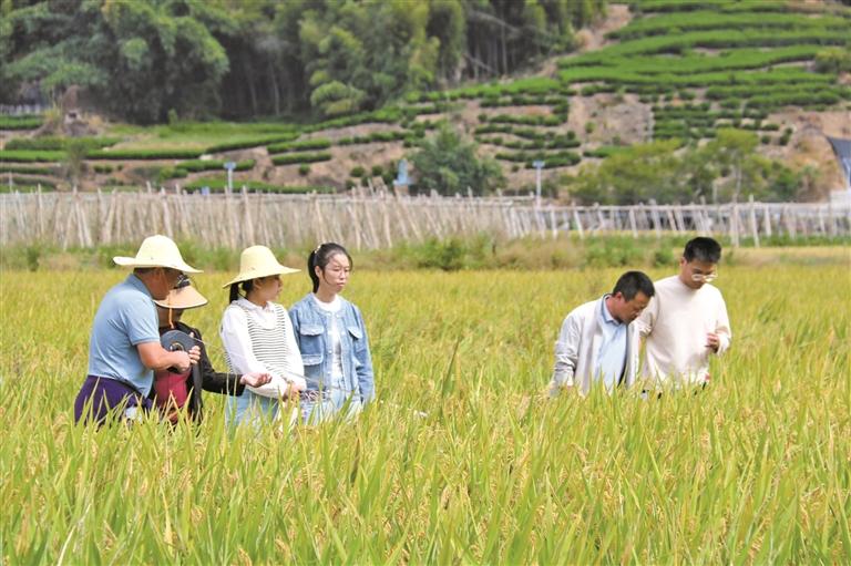 金秋时节,在福鼎市太姥山镇才堡村的优质稻新品种展示示范田里,稻浪翻滚、金穗飘香,甬优106、浙杭优220等新品种迎来丰收季。田垄间,农技专家、种粮大户穿梭其中,逐一观察不同品种晚稻的长势。