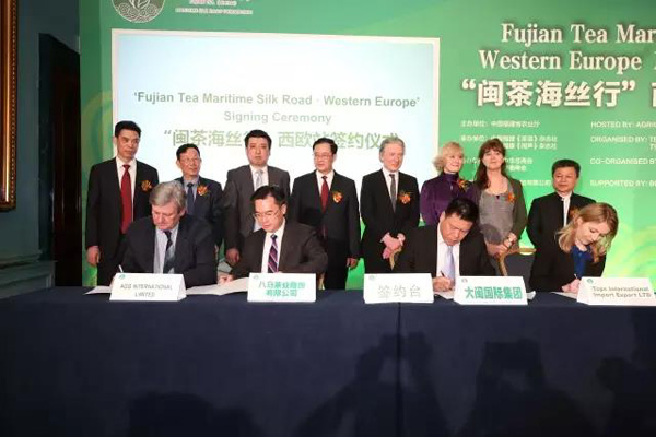 在启动仪式上,我省15家重点茶叶企业与英国贸易伙伴签定了茶叶购销合同,金额达4.86亿元。此外,我省在英国中华总商会设立“闽茶文化推广中心”,借助华人社团宣传普及茶文化,展示销售闽茶产品,以文化交流推动闽茶出口。启动仪式后,我省三和、正山堂、武夷星和春伦等四家重点茶叶企业和英国茶叶学会创始人詹妮弗·伍德就如何推动中英开展茶叶经贸交流与合作进行了深入探讨。省农业厅黄华康厅长代表“闽茶海丝行”经贸代表团向英国中华总商会授牌设立“闽茶文化推广中心”。