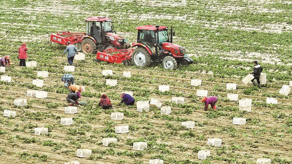 近日,平潭幸福洋吹沙地上一派丰收盛景。作为吹沙填海形成的土地,幸福洋部分田块土壤含盐量曾高达3.2‰至18.27‰,远超农作物耐受阈值,加之土壤颗粒细、孔隙度低、板结严重,一度成为“不毛之地”。2023年,当地联合福建省农科院,采用“物理—化学—生物综合改良法”,通过挖沟排盐、高垄脱盐、喷灌洗盐,搭配酸性肥料与生物菌肥中和碱性,给土地做“深度理疗”,使得土壤含盐量降至2‰左右,板结的盐碱地蜕变为松软的“海绵田”,为农作物生长创造了良好条件。