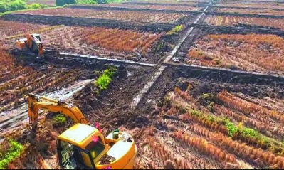 这样的建设,正让农产品的生产变得更有效率。在典村现场看到,推土机将原来弯曲纵横的田埂推平,形成块状的集中连片农田,这便是所谓的“田成方”;“竖成行”,是将平整完的农田改造成长长的条状土堆。这些农田中间,宽阔的硬化水泥路,高标准的灌溉排水设施,已建设完毕。