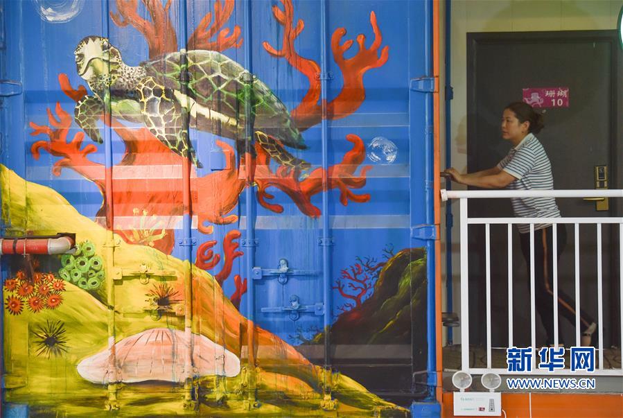 10月16日,在福建泉州晋江金井镇围头村的一家集装箱酒店,工作人员推着布草车从走廊经过。新华社 宋为伟 摄