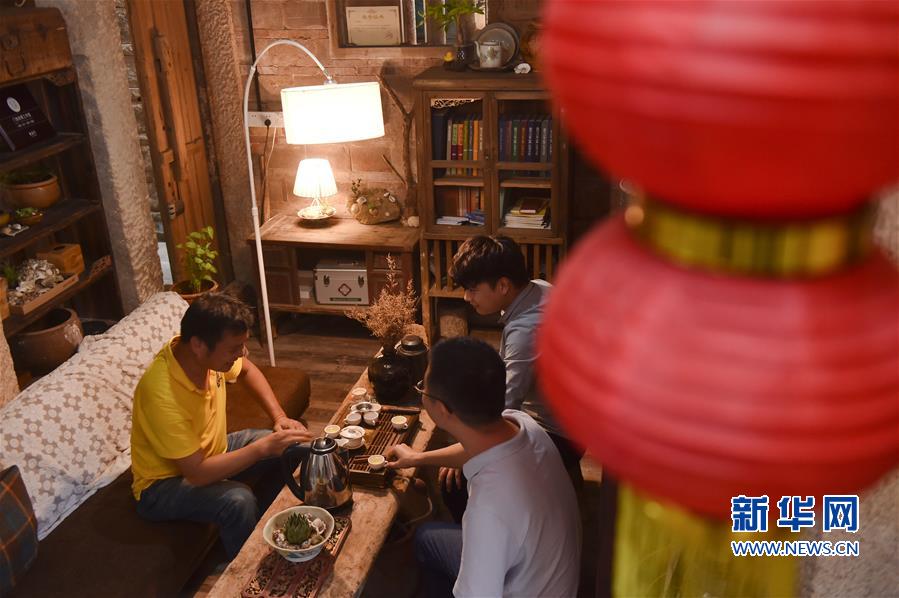 10月16日,在福建泉州晋江金井镇塘东村,几位年轻人在由村里老宅改造成的文创共享空间喝茶聊天。目前,这个共享空间对所有游客和村民免费开放,吸引不少年轻人将这里作为讨论该村文化创意旅游产业发展的场所。新华社 宋为伟 摄
