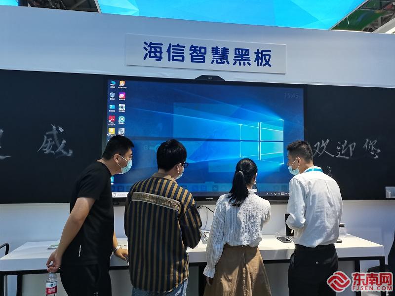 在数博会现场,福建励诚信息科技有限公司总经理刘顶立,每天都要接待来自全省各地采购商。刘顶立的公司主要是供办公设备、多媒体音视频、信息化系统集成解决方案,这次数博会,他带来了公司代理的海信智慧黑板等商用显示产品,吸引了不少采购商的关注。刘顶立告诉,智慧黑板将传统黑板与触控显示一体化深度融合,粉笔书写配合人性化触控操作,打造全新的教学环境,为师生打造互动式课程。