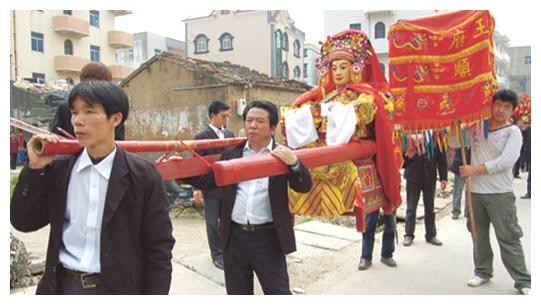 “走街习俗”“走街习俗”活动从塘边街开始,由本村二十四个青壮年后生组成。他们一袭青衣黑裤,白底衬衫,赤脚抬着本宫神明“龙塘宫”,在手执符斗、火把的人引领之下,二十四位后生虎虎生威,健步如飞,稳健凝重地快步绕本村地土一周,并沿途打下桃符,以示镇魔驱邪,祈求吉祥安康。