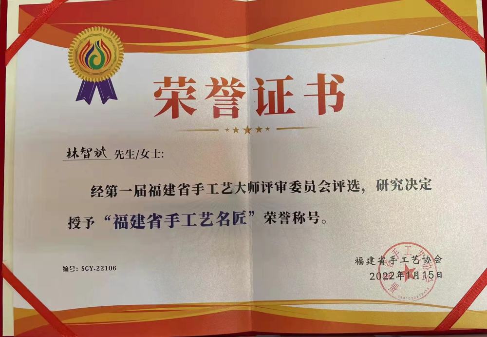 图为林智斌荣获“福建省手工艺名匠”的荣誉证书。