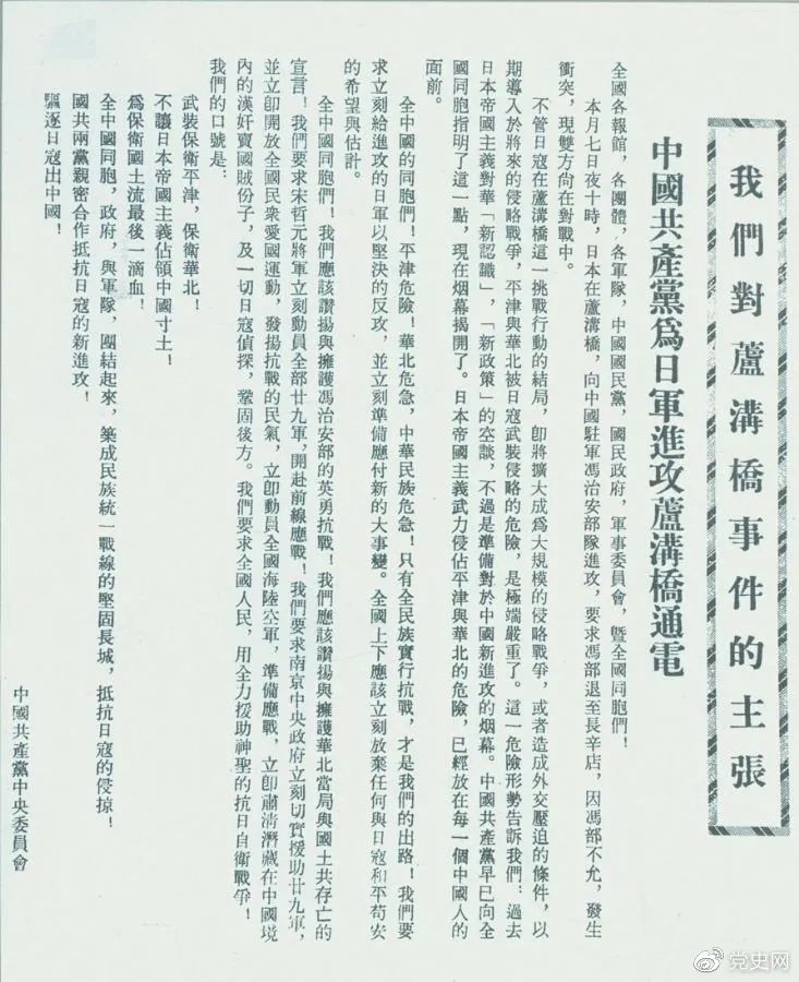 1937年7月8日,中共中央向全国发出《中国共产党为日军进攻卢沟桥通电》,号召全国同胞奋起抗战。