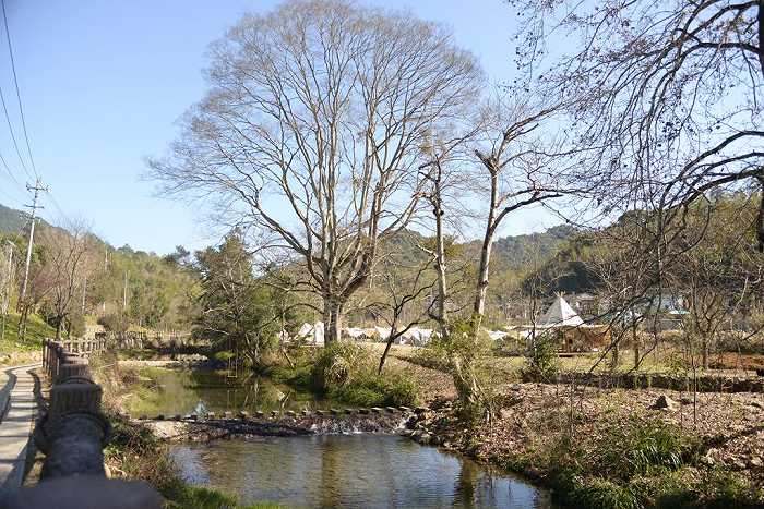 “现在时间还早,跳舞暖和一下,顺便等等游客。”一旁大树上挂着郭泉金“桥下泡茶”的招牌,“游客们喜欢在溪边泡茶”。郭泉金说,最近几年溪水越来越干净,游客也越来越多。