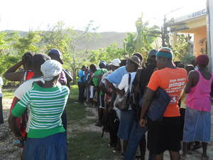 大湾省热雷米的男女排队领取种子,这里是受飓风“马修”影响最严重的区域之一
